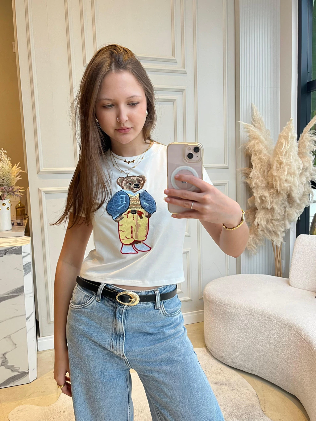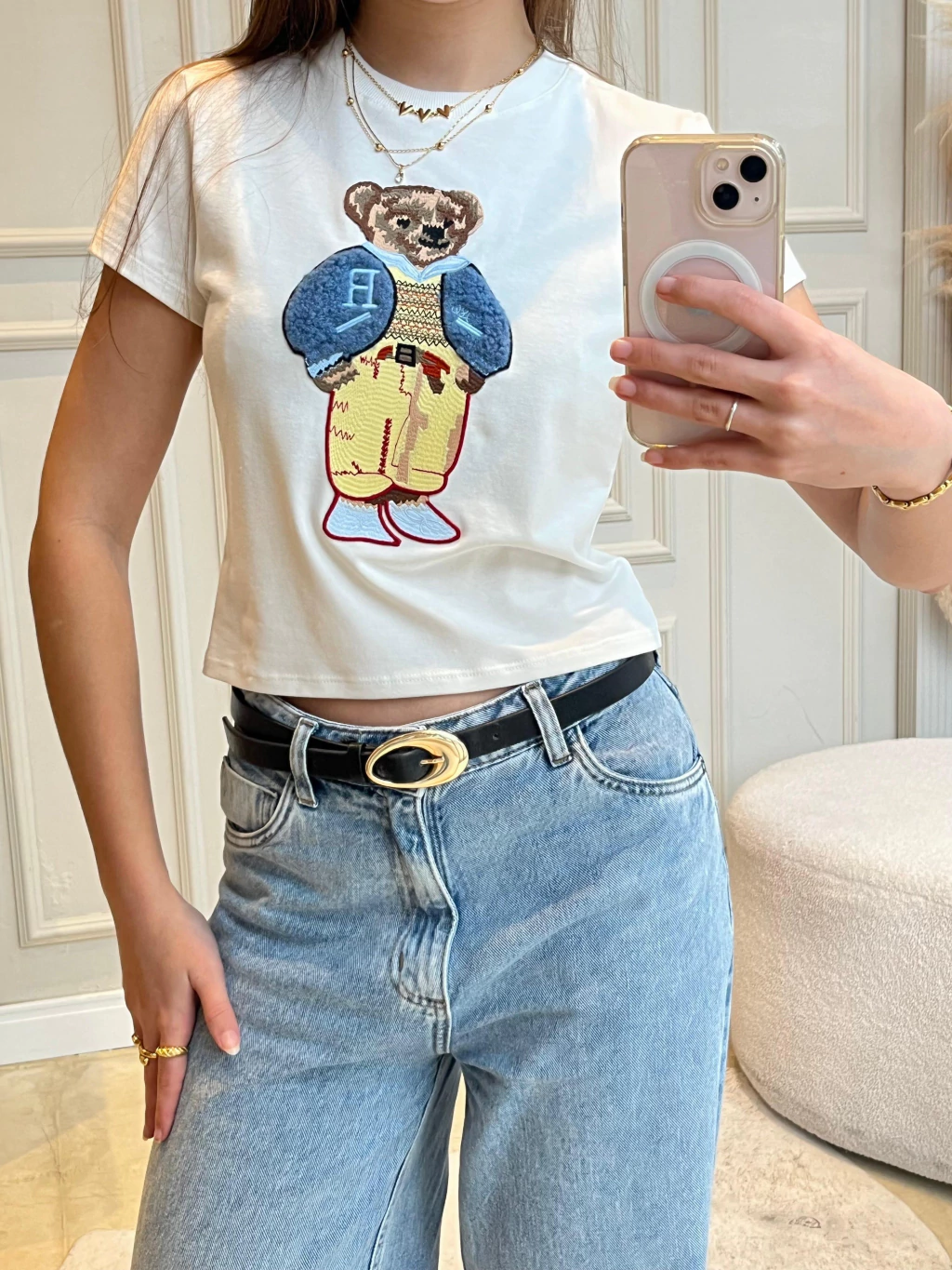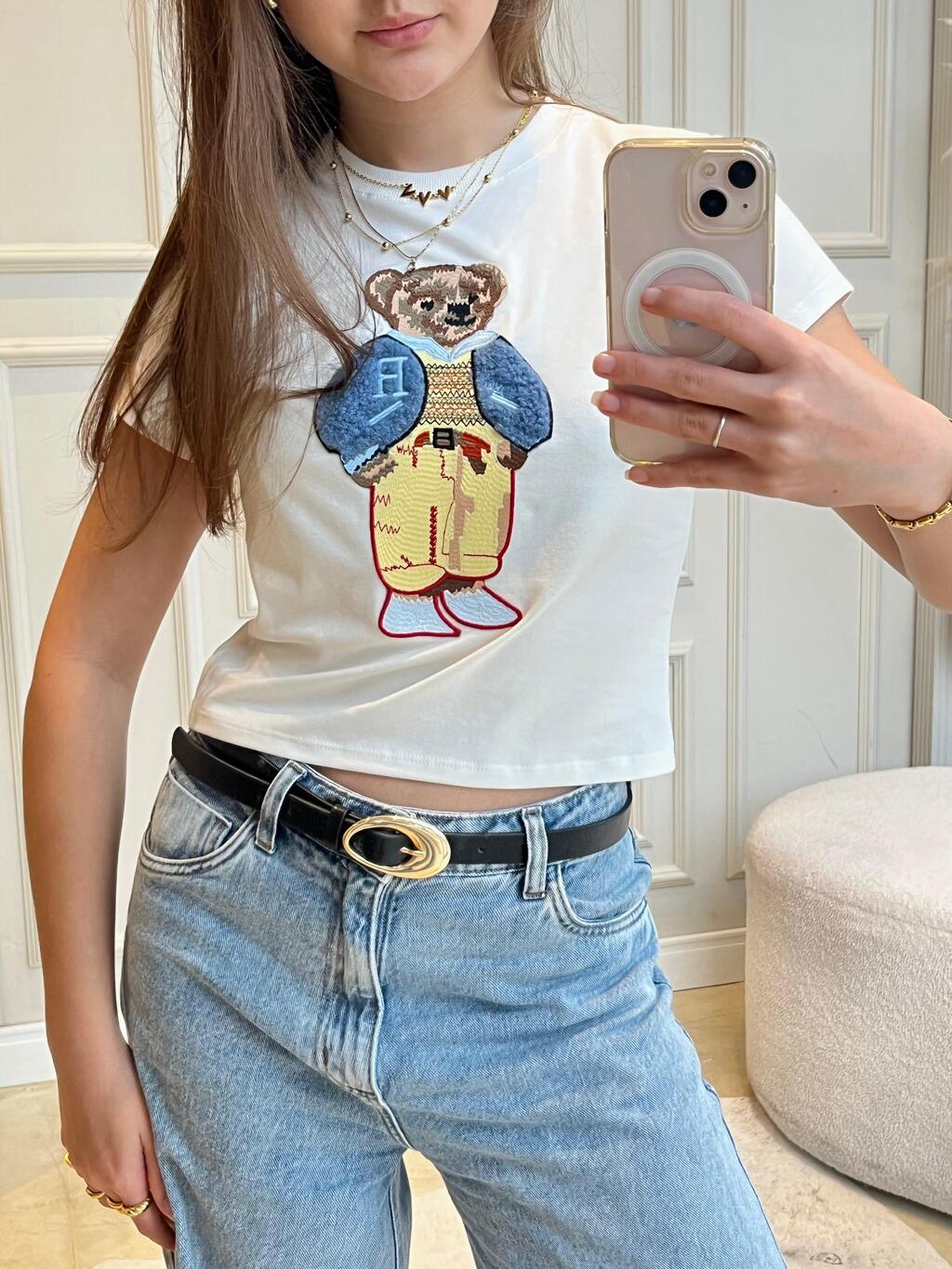 Baby Tee confeccionada em malha 93% algodão premium, traz modelagem ajustada e comprimento levemente mais curto, garantindo um caimento moderno e feminino. O destaque fica para a estampa em relevo do ursinho fashionista, que mistura cores e texturas em uma proposta divertida e estilosa. Perfeita para combinações descomplicadas com jeans, alfaiataria ou até peças mais esportivas, ela é aquele toque fun que transforma o look sem esforço. Para ficar por dentro de todas as novidades e lançamentos da Petit, siga nossas redes sociais @amopetitrose. Avalie seu look no nosso site e receba um cupom de desconto exclusivo!