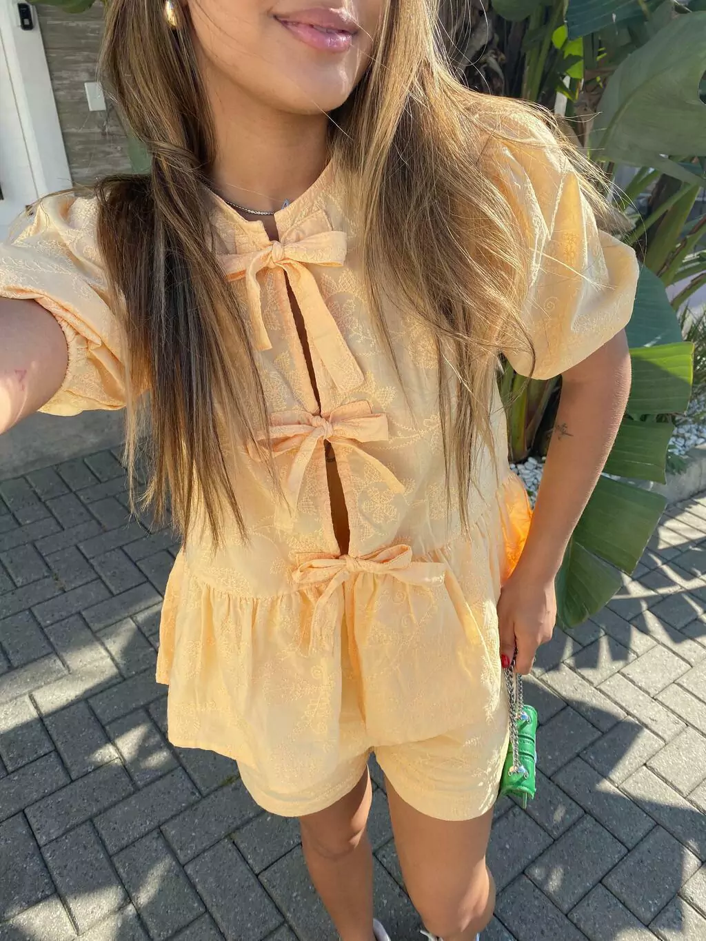 A blusa segue uma das tendências da estação, com mangas bufantes que adicionam volume e feminilidade, fechamento por amarrações e um babado delicado na barra, que confere movimento e leveza. Disponível em um vibrante tom de amarelo, o Conjunto Farfalle pode ser usado tanto junto quanto em peças separadas, permitindo uma variedade de combinações para looks casuais e sofisticados.