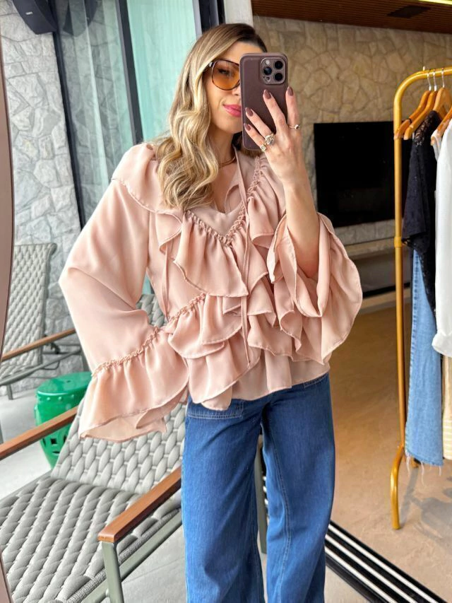 Romântica, fluida e com presença marcante: a Blusa Moss é aquela peça que transforma o look sem esforço. Confeccionada em tecido leve com transparência sutil, ela traz movimento e leveza com sua composição rica em babados assimétricos, que percorrem o corpo em um desenho orgânico e cheio de charme. As mangas amplas e esvoaçantes acompanham o jogo de camadas e criam um efeito visual, ideal para composições delicadas e impactantes. O decote em V suaviza a silhueta e valoriza o colo, enquanto o tom rosé suave reforça a estética feminina, fresh e sofisticada que é assinatura da Petit Rosè. Ideal para ocasiões especiais, produções elegantes ou até mesmo como destaque em um look hi-lo com jeans — a Moss é puro desejo. Para ficar por dentro de todas as novidades do mundo Petit Rosè siga as nossas redes sociais @amopetitrose. Avalie seu look no nosso site e receba um cupom de desconto exclusivo!