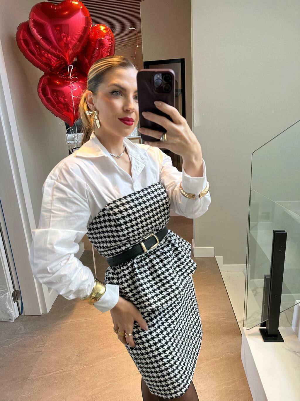 Padrão pied de poule sofisticado, que imprime classe à produção.