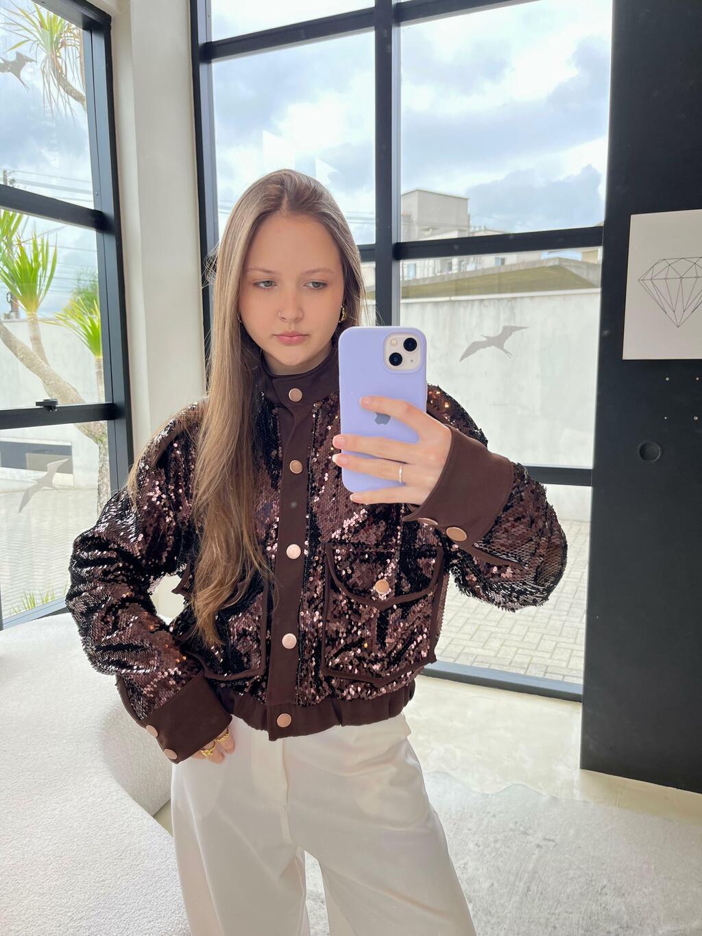 Jaqueta Celine, e uma peça de impacto, feita em patê 100% poliéster com detalhes de alfaiataria 95% poliéster e 5% elastano e forro de viscolycra 96% viscose 4% elastano, com um modelagem over, ela é o mix perfeito entre o glamour e a sofisticação, toda coberta em paetês que contrasta com os detalhes em alfaiataria que estruturam a peça e trazem aquele ar chique e moderno. O forro em viscose garante conforto e caimento impecável, enquanto os botões com banho acobreado especial adicionam um toque de exclusividade. Uma peça statement, que vai do look festa ao casual estiloso quando usada com jeans ou alfaiataria. Ideal para quem quer brilhar com elegância e originalidade. Para ficar por dentro de todas as novidades e lançamentos da Petit, siga nossas redes sociais @amopetitrose. Avalie seu look no nosso site e receba um cupom de desconto exclusivo!