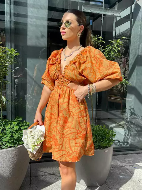Vestido curto confeccionado em algodão, com decote, frente e costas em V, e abertura na cintura com elástico. A peça possui manga princesa saco e elástico no punho. O modelo é lindíssimo, tecido é inteiro bordado, deixando a peça muito mais charmosa. Seu caimento é mais soltinho, uma ótima opção para os dias mais quentes. Combine com sandálias e rasteiras!
