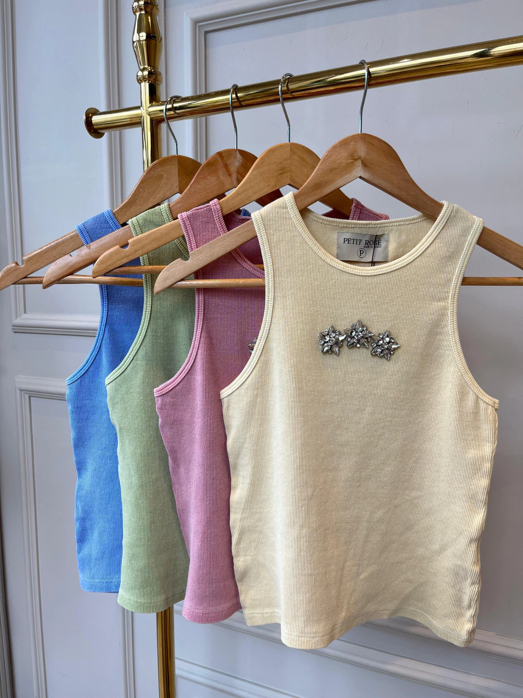 A Regata Eugenia traduz delicadeza e modernidade em uma única peça. Confeccionada em malha canelada macia e levemente ajustada ao corpo, ela garante conforto e caimento perfeito. O grande destaque fica por conta do bordado em pedrarias florais, que adiciona sofisticação e um toque luminoso, transformando a regata em um item especial para o dia a dia ou ocasiões mais elaboradas. Com cores suaves e femininas, a Eugenia é versátil e fácil de combinar, sendo a escolha ideal para elevar produções básicas com elegância imediata. Para ficar por dentro de todas as novidades e lançamentos da Petit, siga nossas redes sociais @amopetitrose. Avalie seu look no nosso site e receba um cupom de desconto exclusivo!