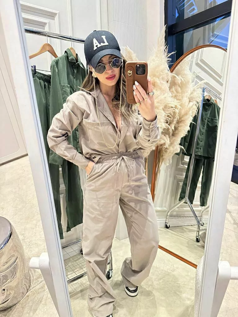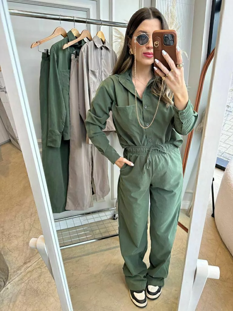 Um conjunto confortável, elegante e versátil, disponível em verde que é uma cor tendência para estação e fendi que é um neutro atemporal. Pode ser usado como conjunto ou separadamente formando diversas opções de looks.