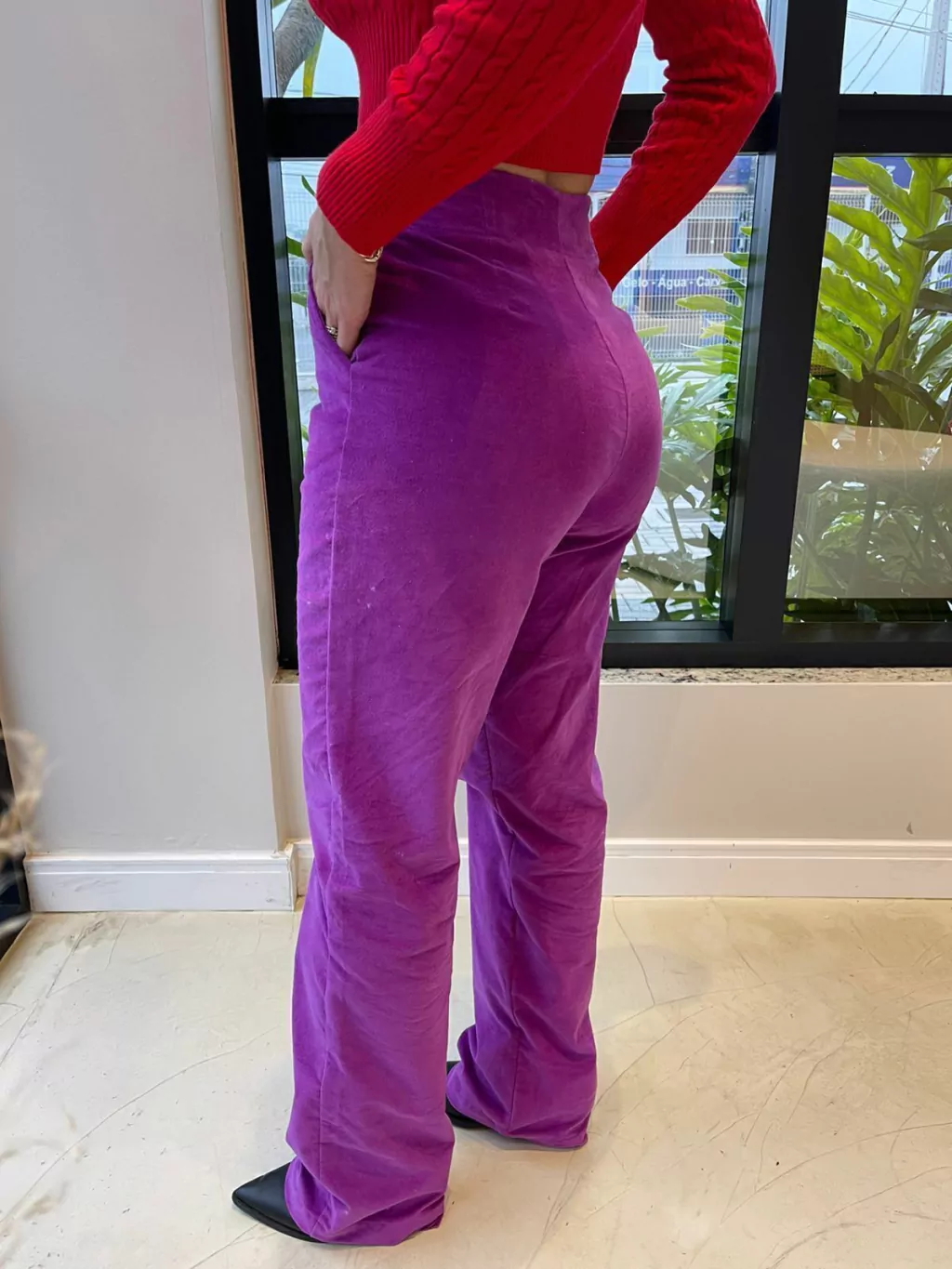 Calça wide leg com tecido semelhante ao (camurça). Com bolso faca frontal e fechamento por botão e zíper, não possui passantes. Modelo veste super bem e é extremamente confortável, ideal para montar looks mais casuais. Abuse das t-shirts e croppeds!