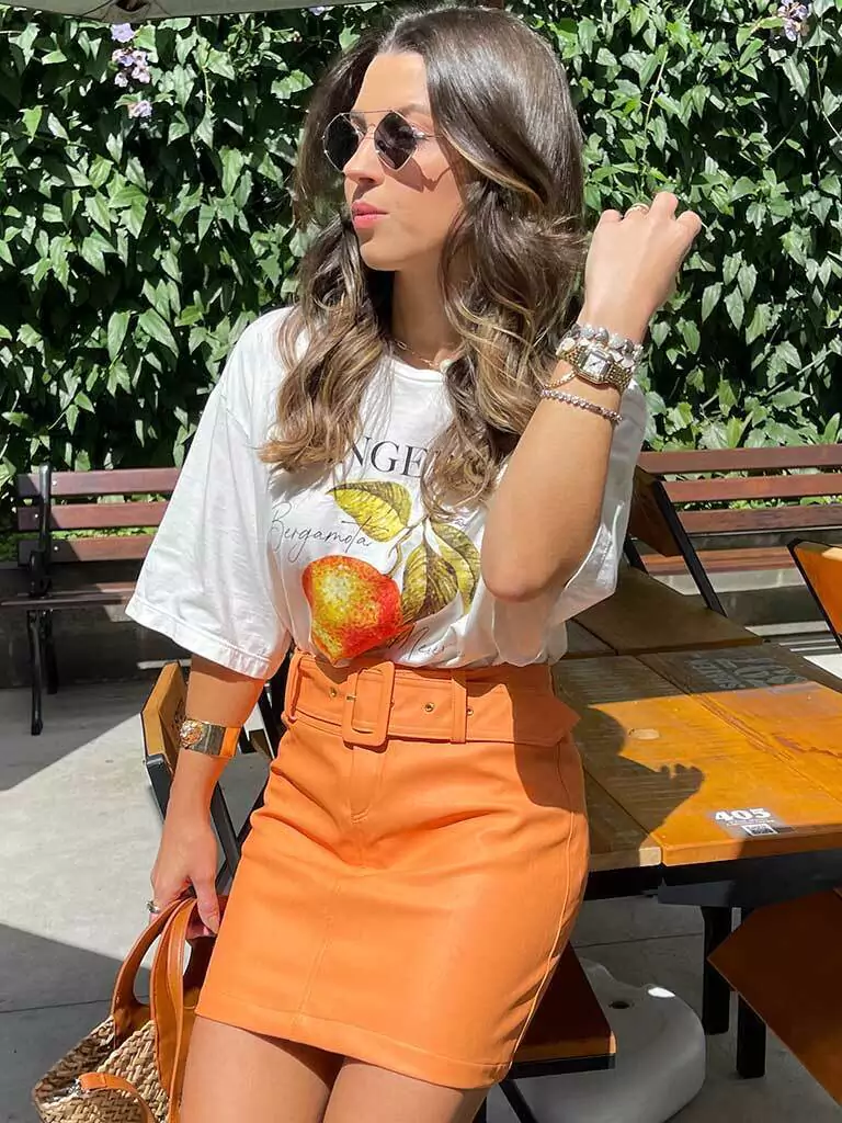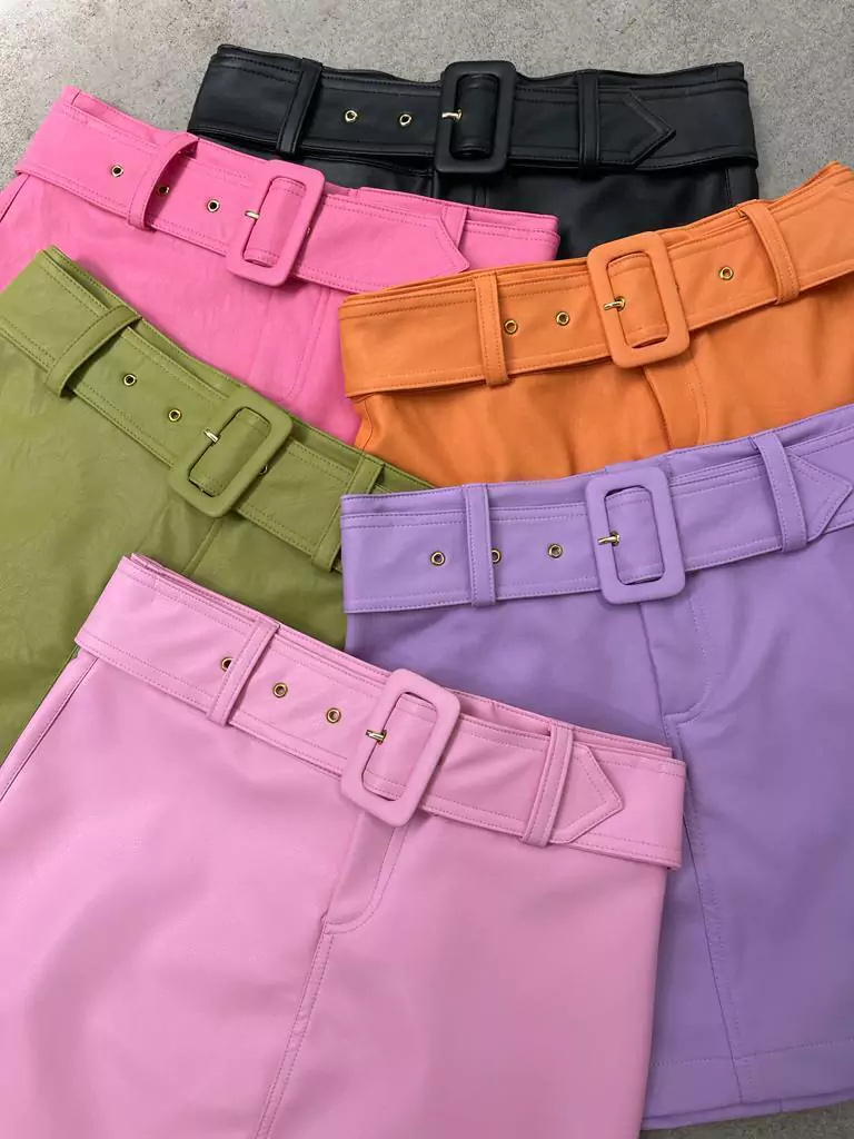 Saia curta confeccionada em material sintético, com cintura alta e duas pences na parte de trás. Acompanha cinto para melhor ajuste no corpo. Modelo veste tamanho P.