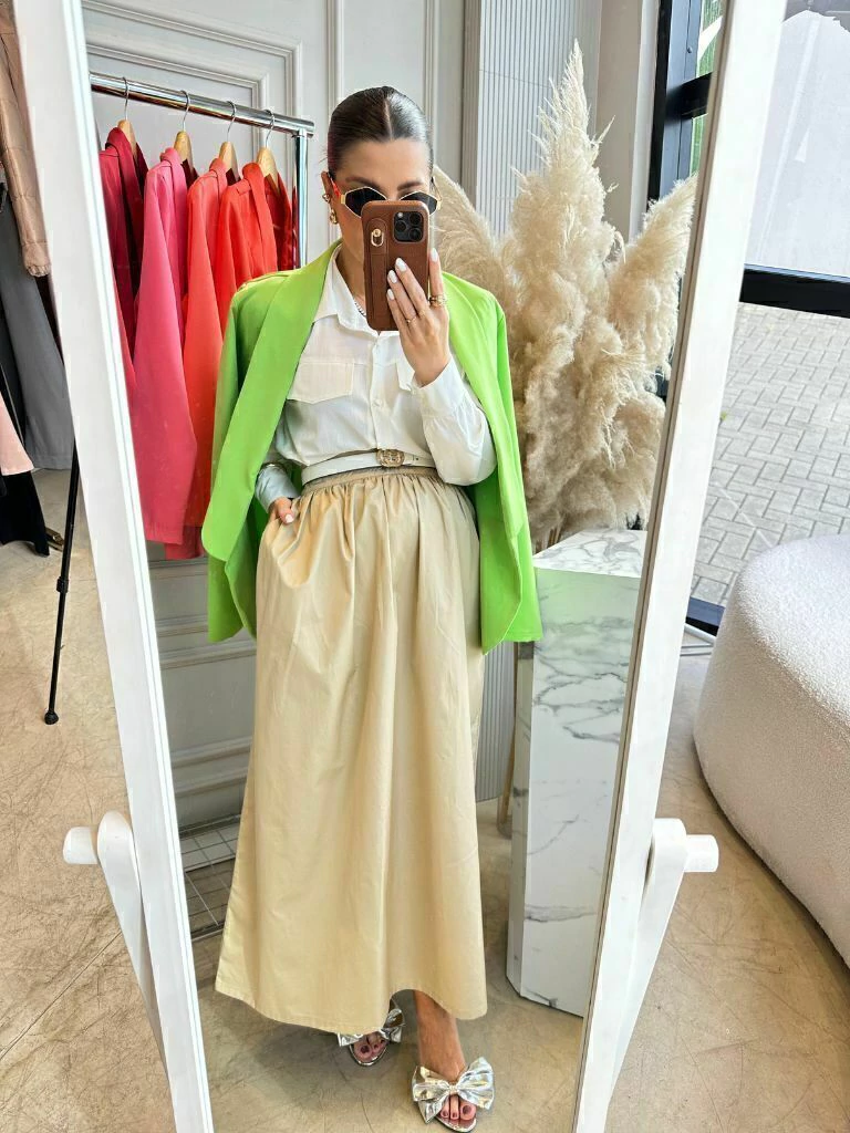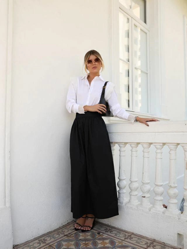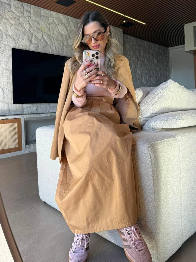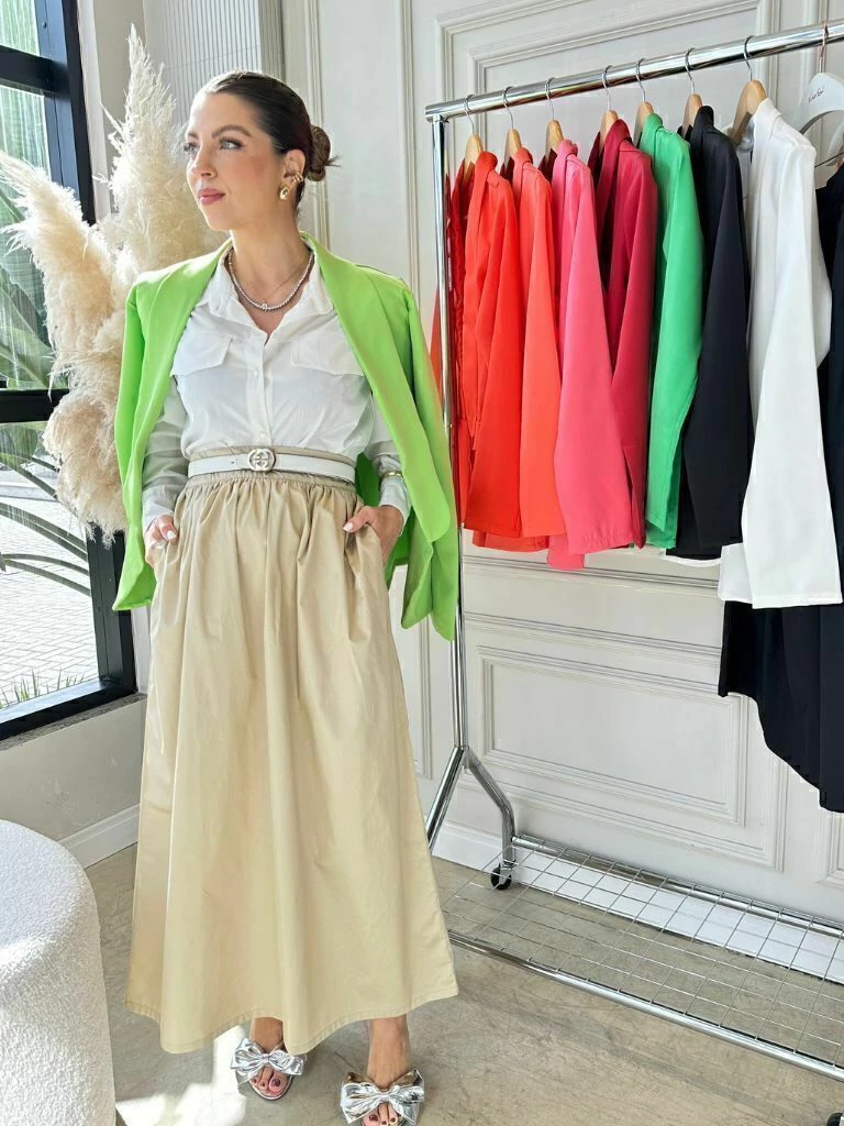 A Saia Havanna é feita de tecido 100% algodão de alta gramatura, oferecendo um caimento estruturado e elegante. Com comprimento midi e cós largo que define a cintura, possui um zíper invisível para acabamento impecável. A modelagem rodada e franzida na cintura confere um toque clássico e feminino, com bolsos que adicionam praticidade. Disponível em marfim, camel e preto, é ideal para um visual sofisticado e versátil. Para ficar por dentro de todas as novidades do mundo Petit Rosè siga as nossas redes sociais @amopetitrose.