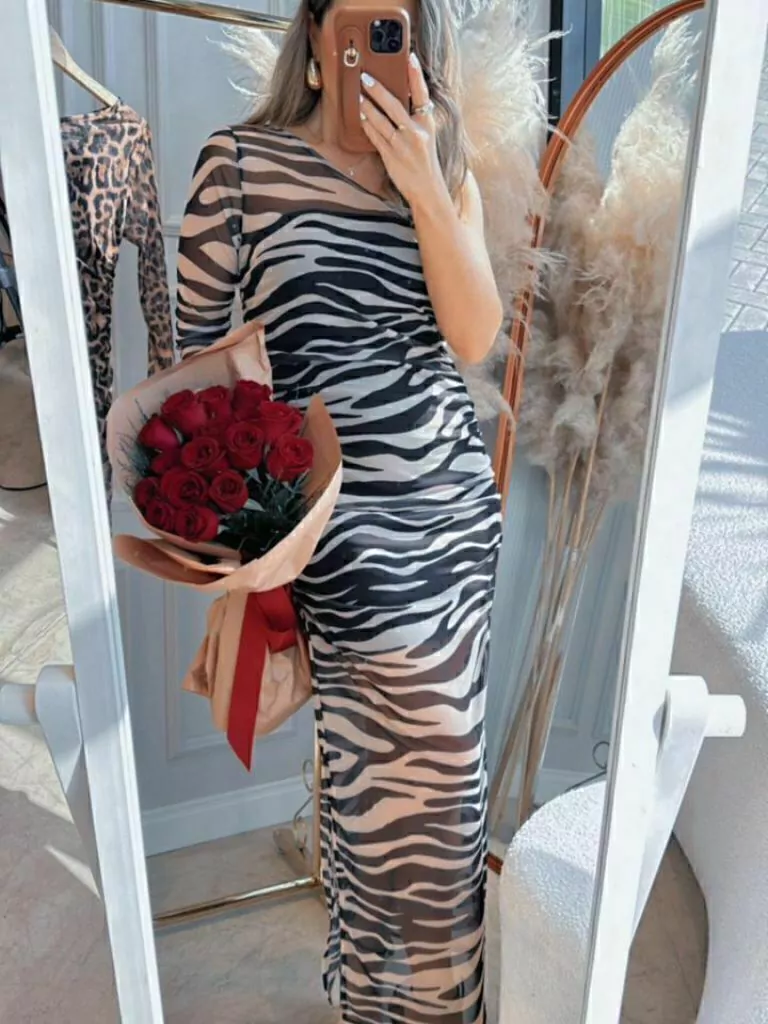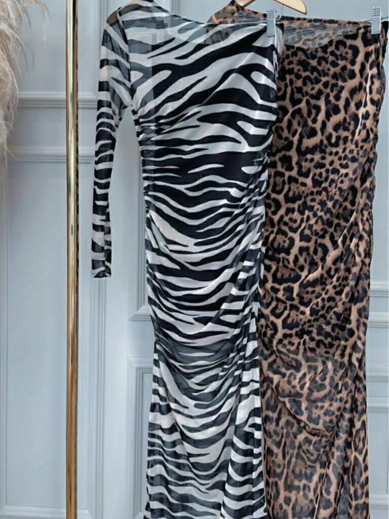 O vestido midi Savage da Petit Rose é feito de tule com elastano e possui uma estampa animal print exclusiva. A peça tem decote assimétrico com um ombro só, manga longa, e lateral franzida para melhor ajuste, além de uma fenda elegante na barra. Acompanha um forro de viscolycra sem alças, mais curto, para maior conforto e um toque sofisticado.