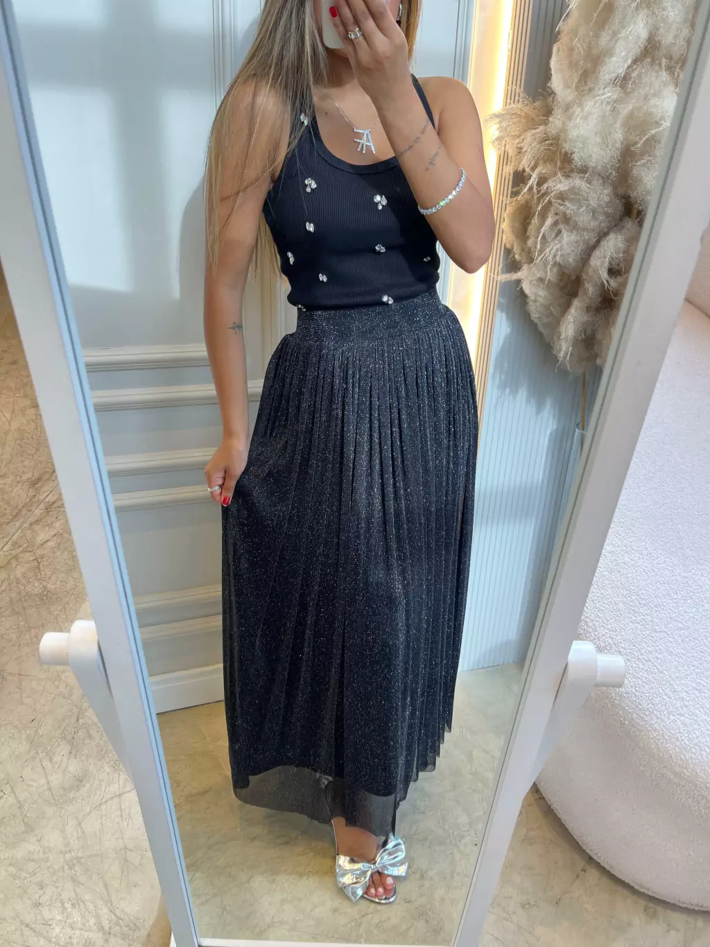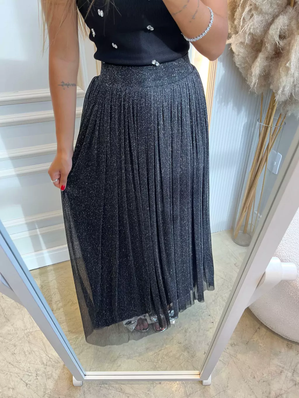 A Saia Michele, feita em tule com lurex e forro em viscolycra, tem modelagem solta e cintura marcada, combinando sofisticação e conforto para benefícios formais, com salto e um body preto. Para ficar por dentro de todas as novidades e lançamentos da Petit, é só seguir as nossas redes sociais @amopetitrose.