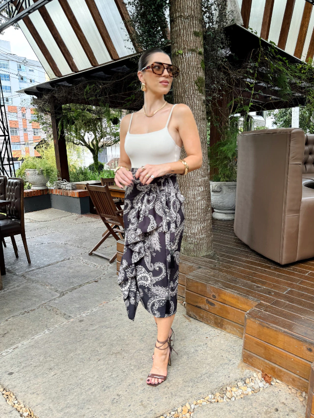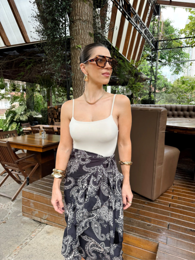 A saia envelope Aura é feita em 94% Poliester e 6% Elastano, com estampa paisley, oferecendo leveza e fluidez. Sua modelagem versátil permite várias formas de amarração, com design transpassado que garante ajuste perfeito e charme. É ideal para looks frescos e modernos. Para ficar por dentro de todas as novidades e lançamentos da Petit, é só seguir as nossas redes sociais @amopetitrose.