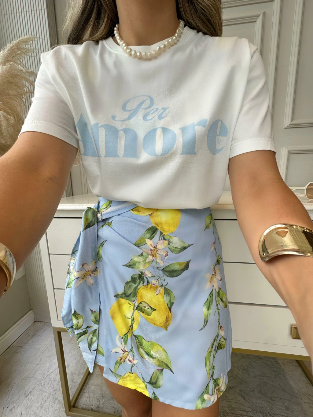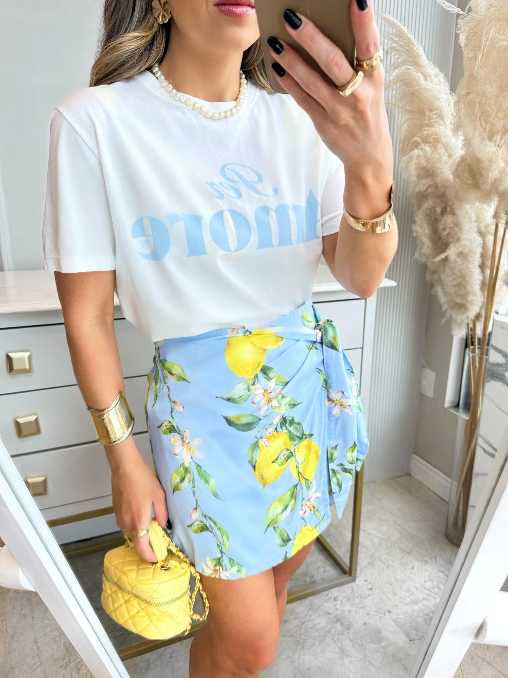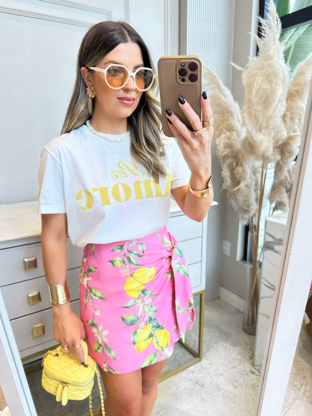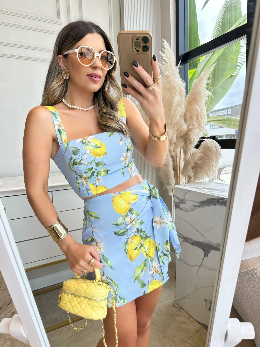 O conjunto Limone é feito de viscose com estampa exclusiva, composto por short saia de cintura alta e blusa com pregas e faixas para amarração, ideal para o verão. Para ficar por dentro de todas as novidades aqui da Petit, e para ver mais looks de inspiração, siga nossas redes sociais @amopetitrose.