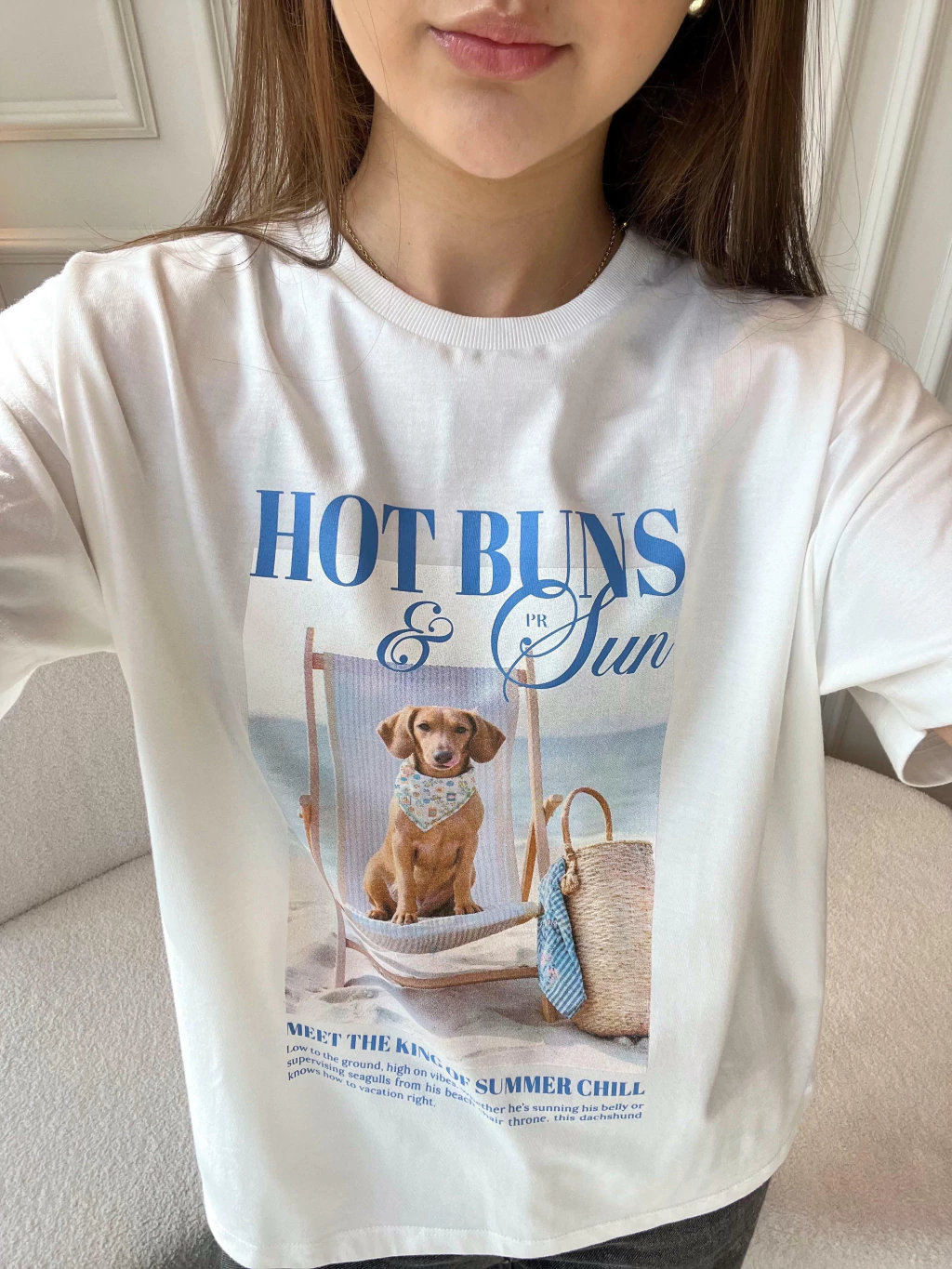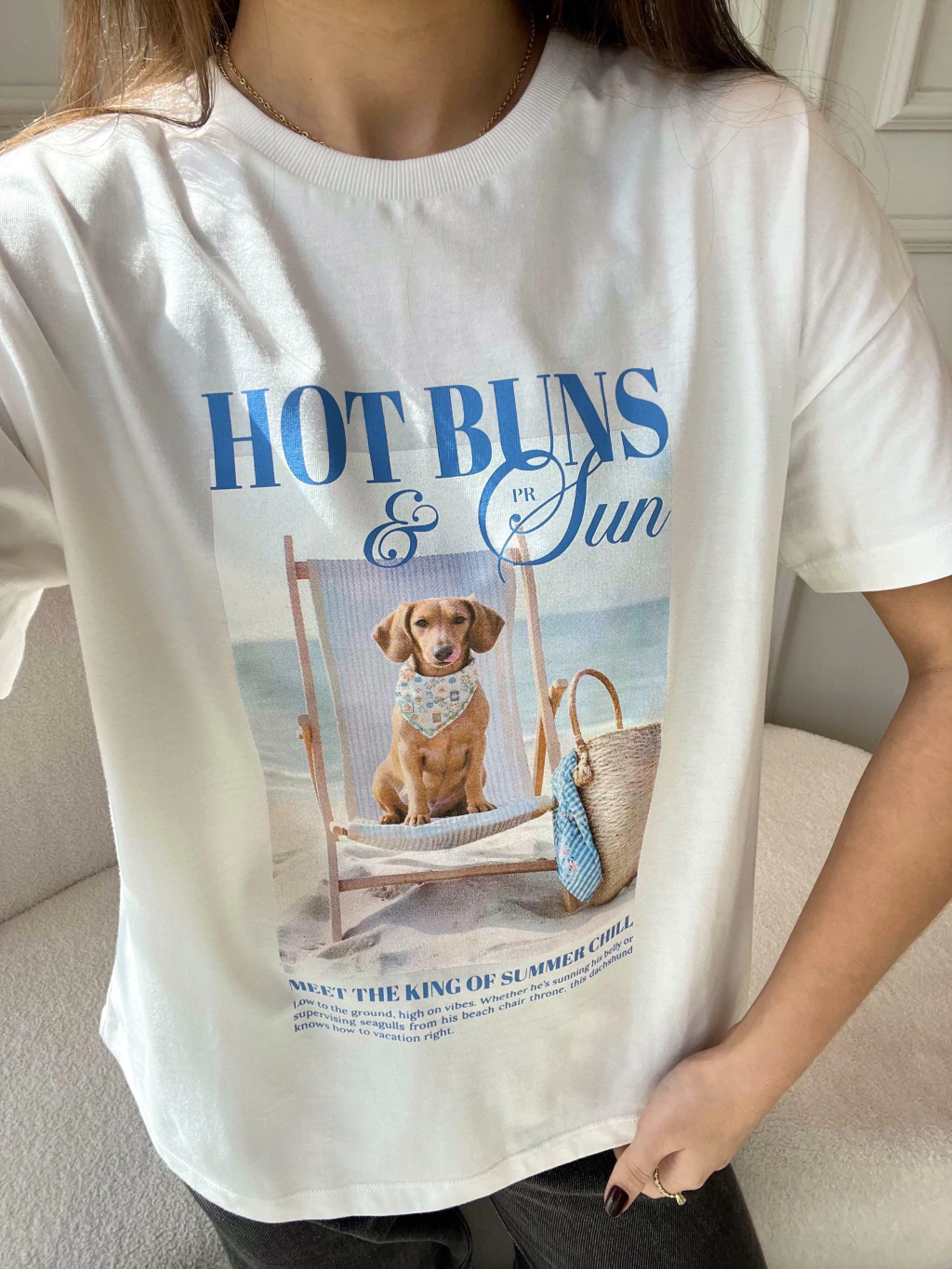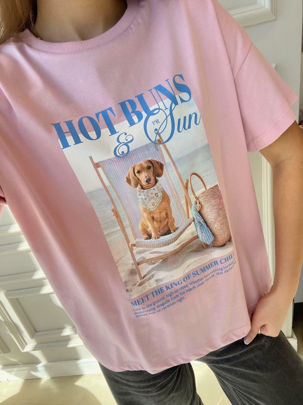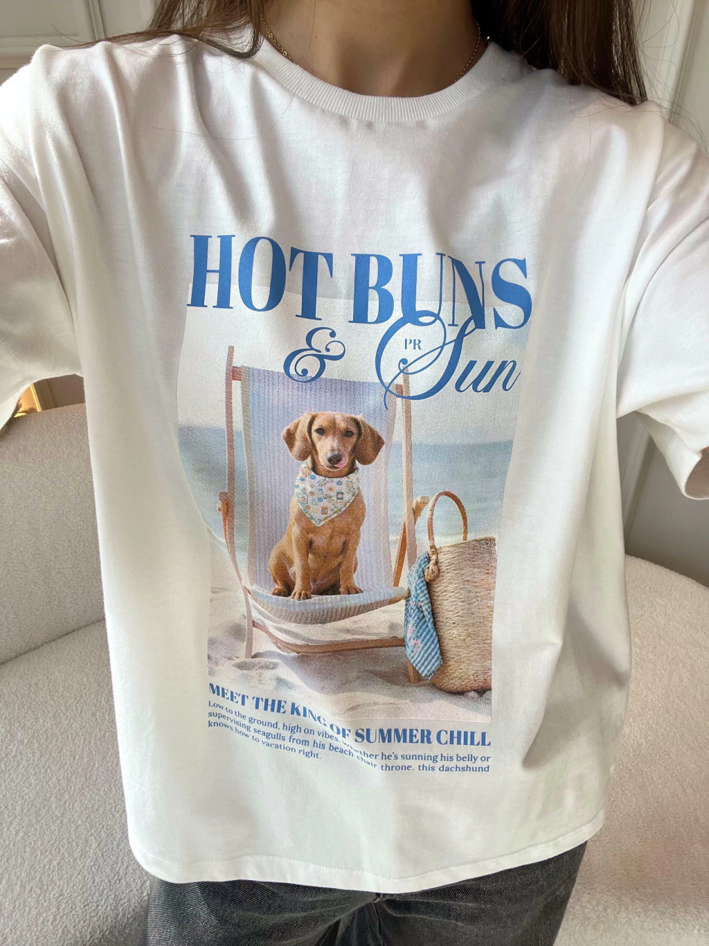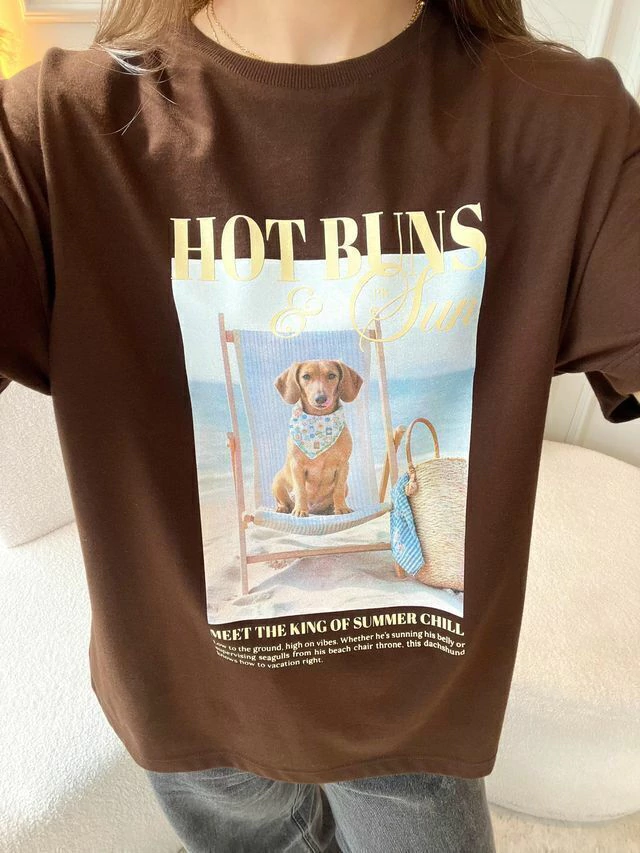 Descontraída, divertida e com um toque de irreverência solar, a T-shirt Hot Buns é a escolha perfeita para quem leva o verão (e o estilo!) com bom humor. Com toque macio e caimento leve, ela traz estampa exclusiva de um simpático dachshund curtindo a brisa do mar em sua espreguiçadeira. A modelagem é básica, com decote redondo e manga curta, ideal para combinações com shorts, saias ou sobreposições com peças de alfaiataria. Uma peça que vai direto pro look do dia — e pro feed também! Para ficar por dentro de todas as novidades do mundo Petit Rosè siga as nossas redes sociais @amopetitrose. Avalie seu look no nosso site e receba um cupom de desconto exclusivo!