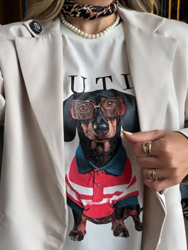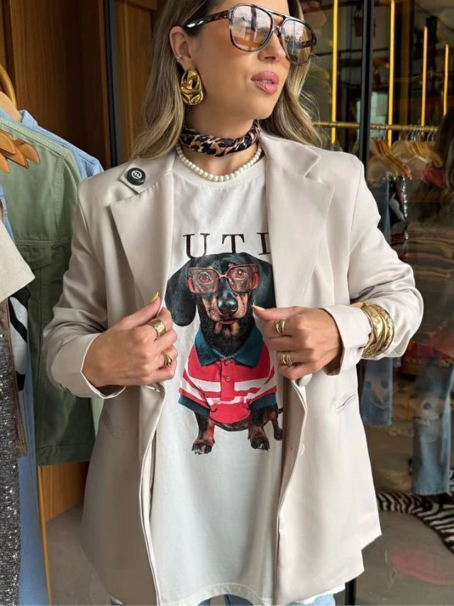 Estampa divertida: cachorro fashionista que traz irreverência e autenticidade ao look.