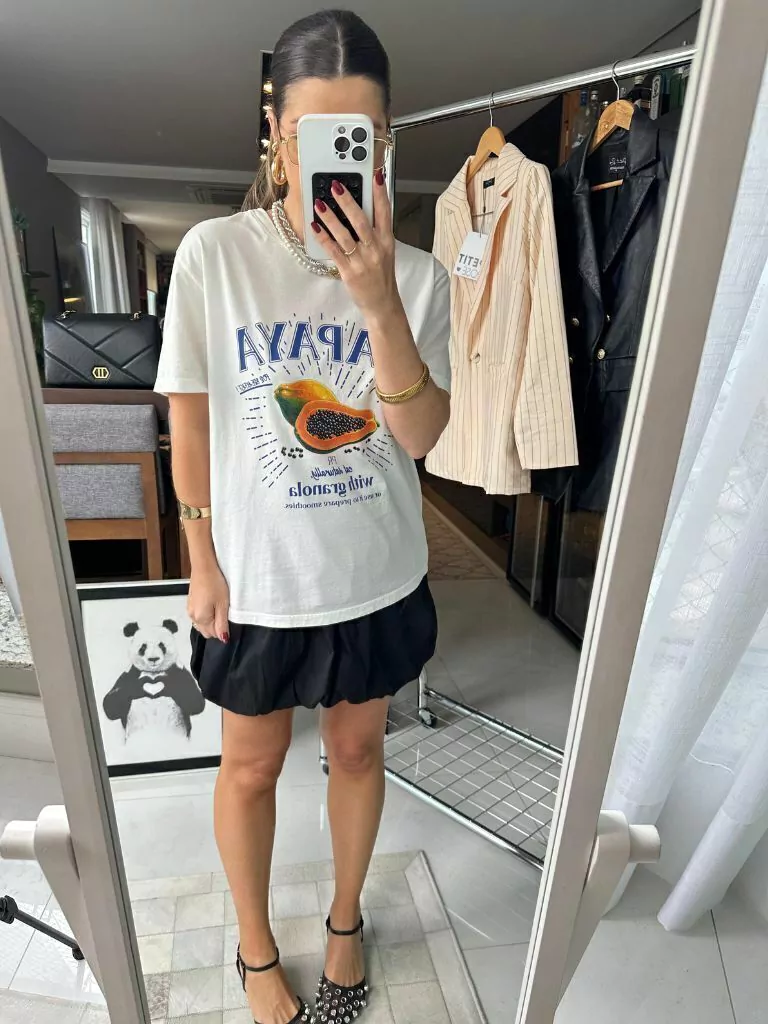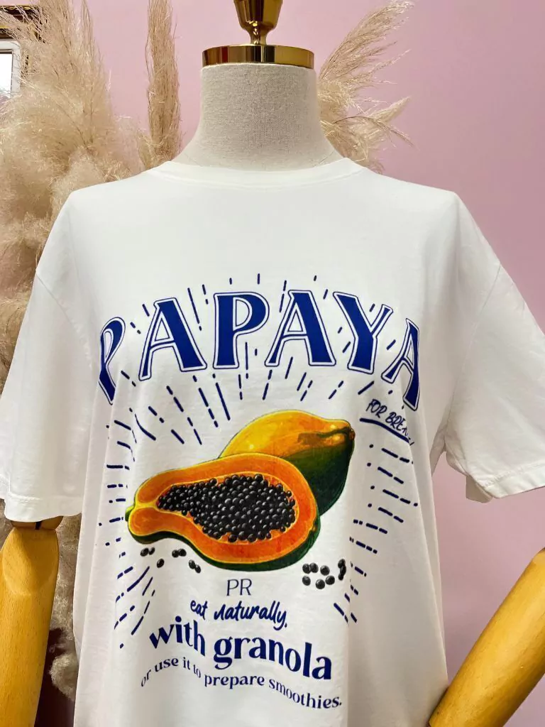 T-Shirt Feminina Básica, com decote redondo, manga curta e estampa frontal de Papaya (mamão). Possui modelagem mais ajustada ao corpo, sinônimo de estilo e conforto.