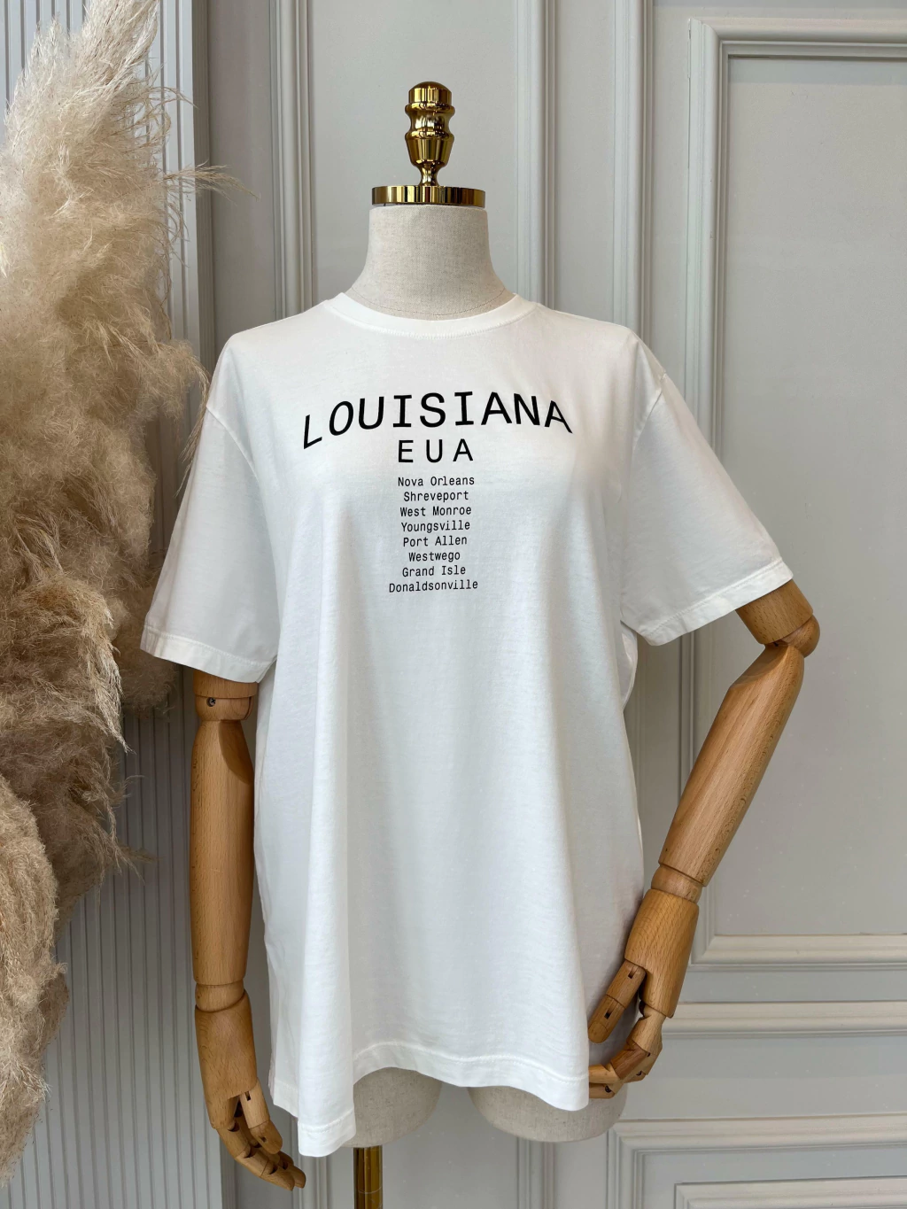 T-Shirt Básica Louisiana com decote redondo e manga curta, com estampa frontal. A peça possui modelagem mais ajustada ao corpo. A T-shirt é na cor off white, podendo escolher a cor da estampa da peça. Super democrática e versátil, as Tee são sinônimos de beleza e conforto. Modelo usa tamanho P. A dica da Petit é combinar com a Calça Wide Leg Anny, deixando o look super estiloso e versátil! Para ficar por dentro de todas as novidades do mundo Petit Rosè siga as nossas redes sociais @amopetitrose.