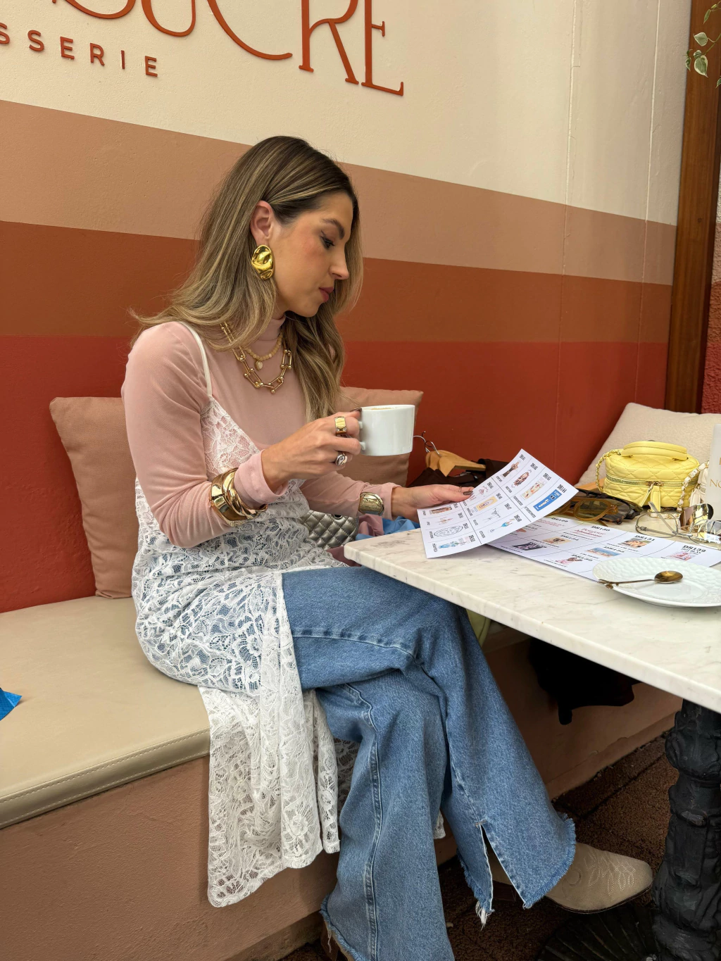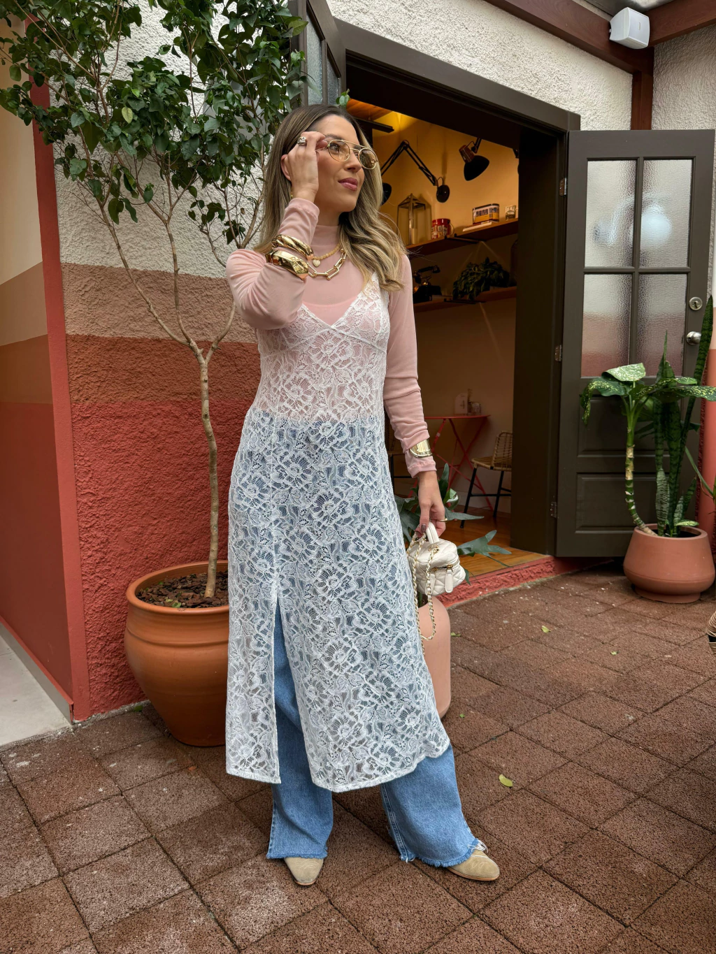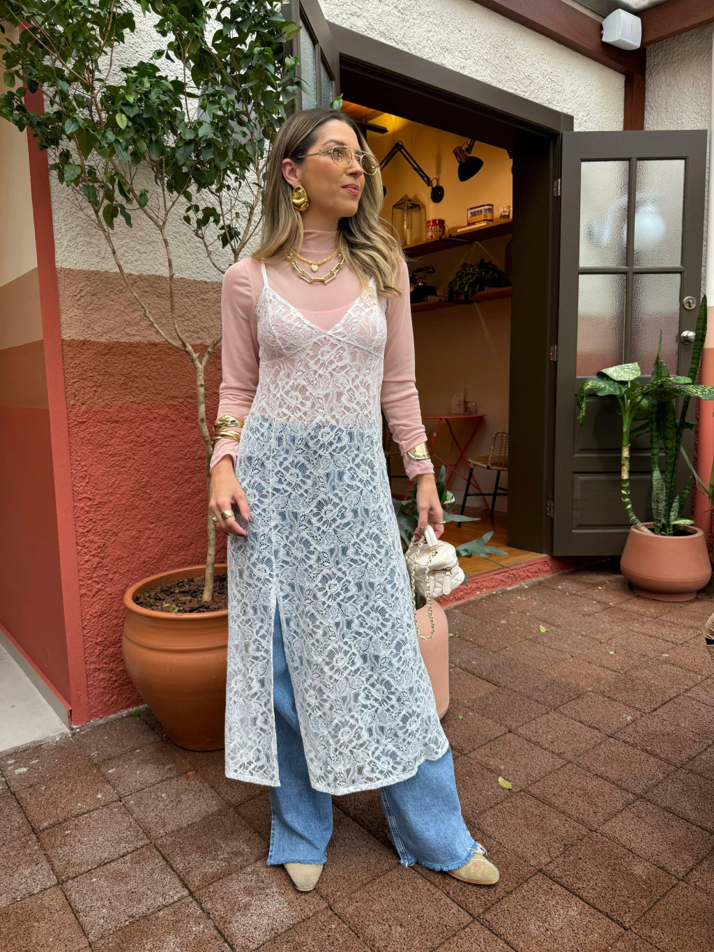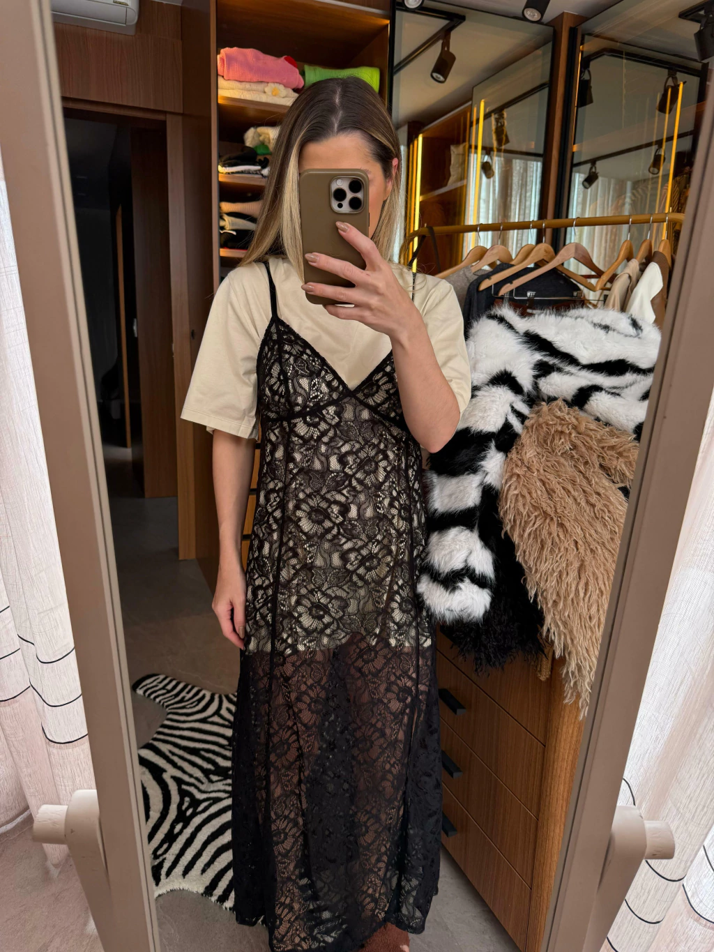 Vestido de renda Estala, feita em renda com toque premium. Ele chegou pra roubar a cena dos looks mais descolados! O truque de styling preferido das it girls. Com transparência estratégica e modelagem fluida, ele é feito pra sobrepor, e transformar qualquer visual básico em algo simplesmente fashion-forward. A renda floral cria um jogo visual sofisticado e sensual, revelando com elegância o que está por baixo. A modelagem tipo camisola, com alcinhas finas e decote em V que modela perfeitamente o busto,, traz aquela estética “lingerie à mostra” que é hit absoluto nas passarelas e no street style. Use por cima de camisetas básicas, sobre vestidos ajustados, com conjuntos de alfaiataria, ou até com hot pants + top para eventos noturnos. É versátil, ousado, e totalmente fora do óbvio. Para ficar por dentro de todas as novidades aqui da Petit Rosè siga as nossas redes sociais @amopetitrose. Avalie seu look no nosso site e receba um cupom de desconto exclusivo!